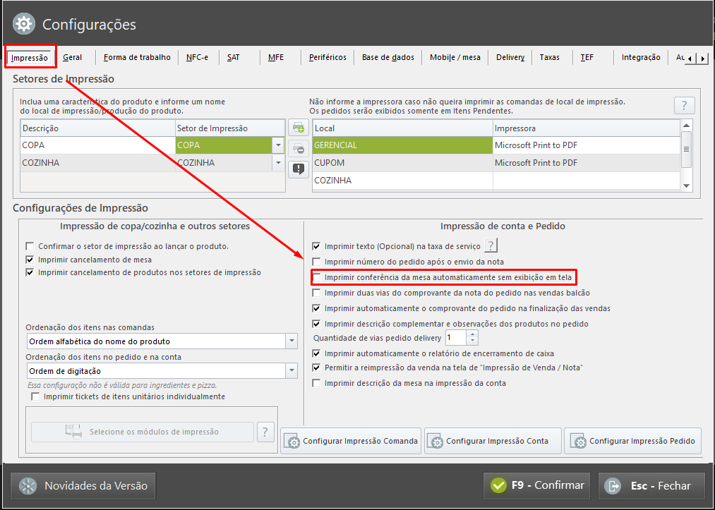 - Procure e marque a caixa "Imprimir conferência de mesa automaticamente sem exibição em tela".