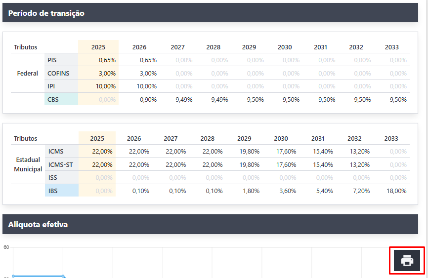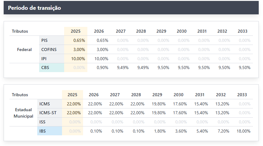 Posicionado ao lado do grupo “Configurações”, temos o agrupamento de “Período de transição”, onde abaixo constam as colunas de “Tributos” em uma sequência iniciada em “2025” e finalizadas em “2033”. Essas colunas demonstram as alíquotas dos tributos federais, estaduais e municipais em cada ano do período transitório. Assim, podemos ver na prática como os impostos serão unificados no decorrer dos anos e como as alíquotas serão alteradas. A tela é dividida em dois grupos: