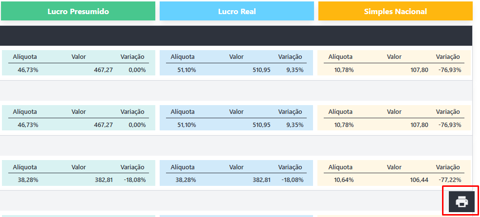 Além de todas as funcionalidades apresentadas no Simulador Tributário Web, é possível também imprimir todos os dados simulados, transformando-os em um relatório.