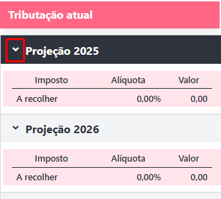 Para expandir a Tributação Atual de 2025 e verificar detalhadamente a alíquota e o valor de cada tributo, basta clicar na seta ao lado de "Projeção 2025" (como exibido na imagem ao lado). Para os demais anos, siga o mesmo processo, clicando na seta ao lado da "Projeção do ano" que deseja avaliar a carga tributária baseada no cenário atual.