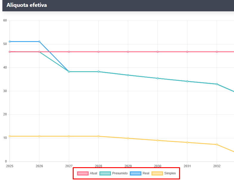Abaixo do grupo de tributos, um gráfico de linhas será apresentado, demonstrando visualmente um comparativo das alíquotas efetivas de cada regime de tributação. Esse comparativo abrangerá cada ano do período de transição, de 2026 a 2033. As linhas do gráfico terão as seguintes legendas e cores: