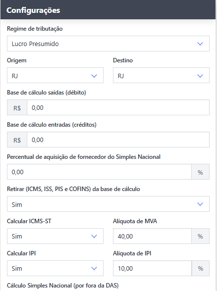 Ao acessar o Simulador, observa-se no canto esquerdo da tela o conjunto de informações atribuídos a Configurações. Nessa parte da tela, deve ser preenchido as informações baseadas na simulação que se deseja fazer. São elas:
