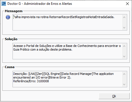 Ao tentar consultar nota na escrituração apresenta a falha: