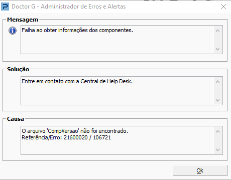 A situação ocorre devido a ausência do arquivo COMPVERSAO.BTR dentro da pasta ?:\Prosoft.win\Scop. O mesmo pode ter sido removido por um antivírus ou a pasta não possui permissões para substituição durante atualização.