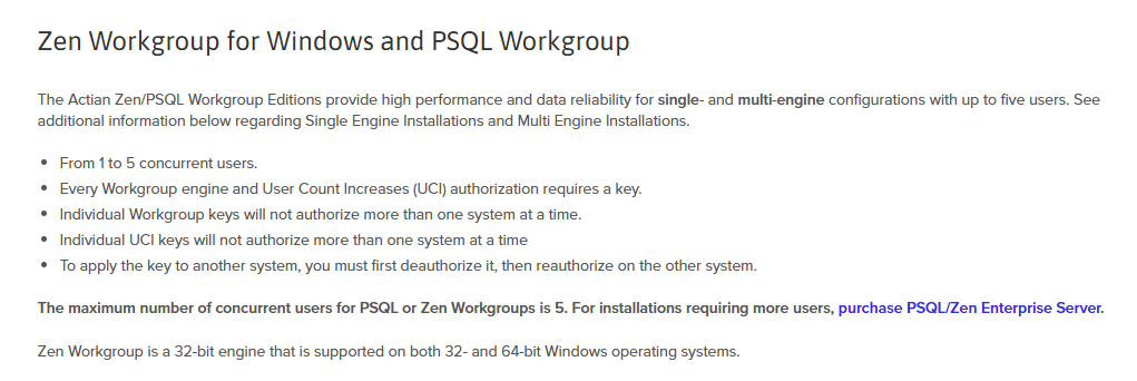 Sucintamente, o código principal dos mecanismos é o mesmo, mas o PSQL Workgroup Engine é licenciado para pequenos grupos de trabalho (até 5 usuários simultâneos no máximo) e tem um preço consideravelmente menor como resultado.