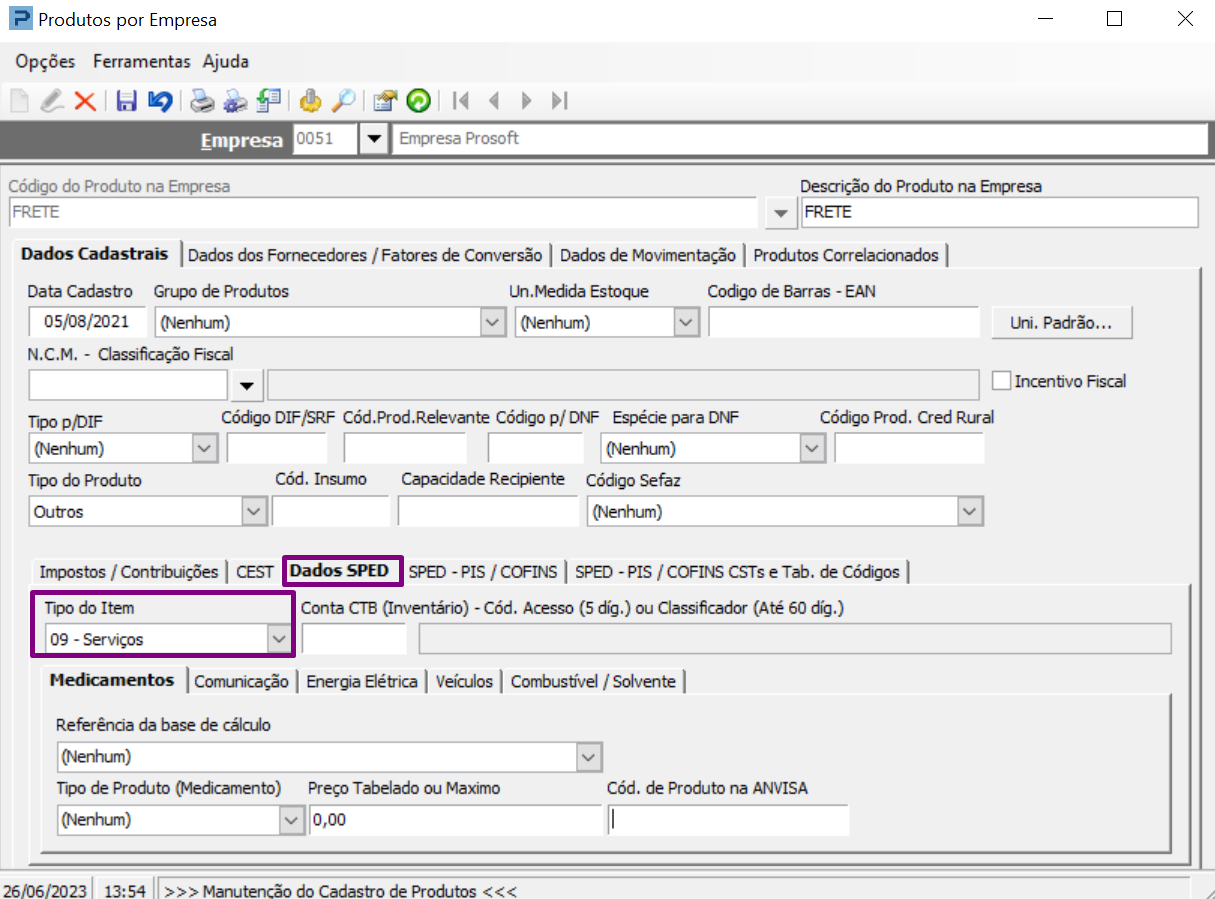 2- No sistema Gerenciador de Aplicativos Prosoft (GAP) para que sejam geradas corretamente as informações de conhecimento de transporte é necessário cadastrar um produto fictício e informar em dados Sped que produto se trata de um serviço.