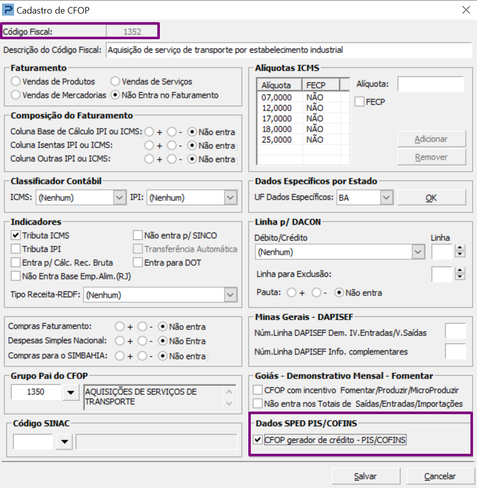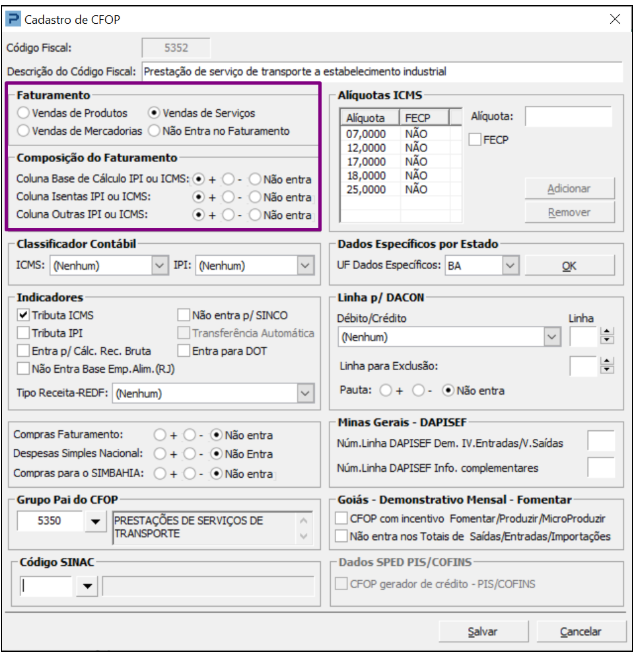Abaixo segue as parametrizações necessárias no cadastro do CFOP para que as notas sejam geradas no arquivo.