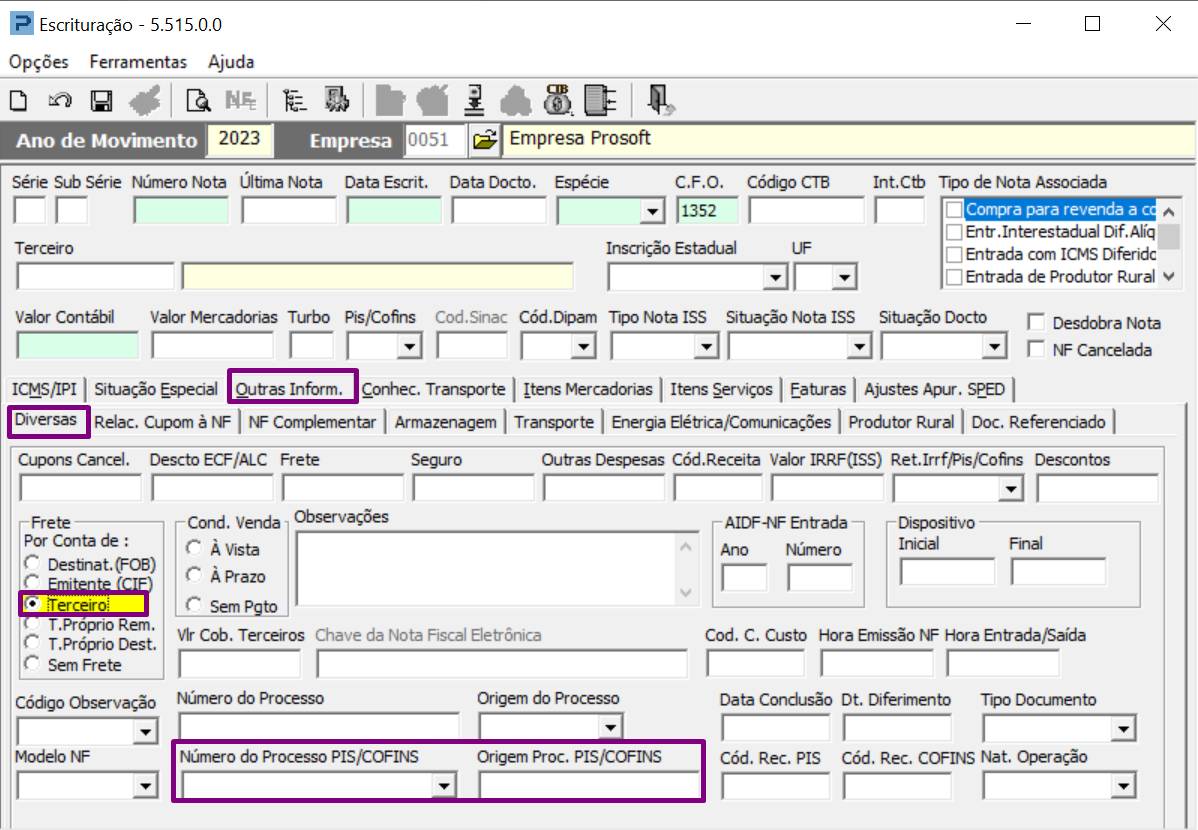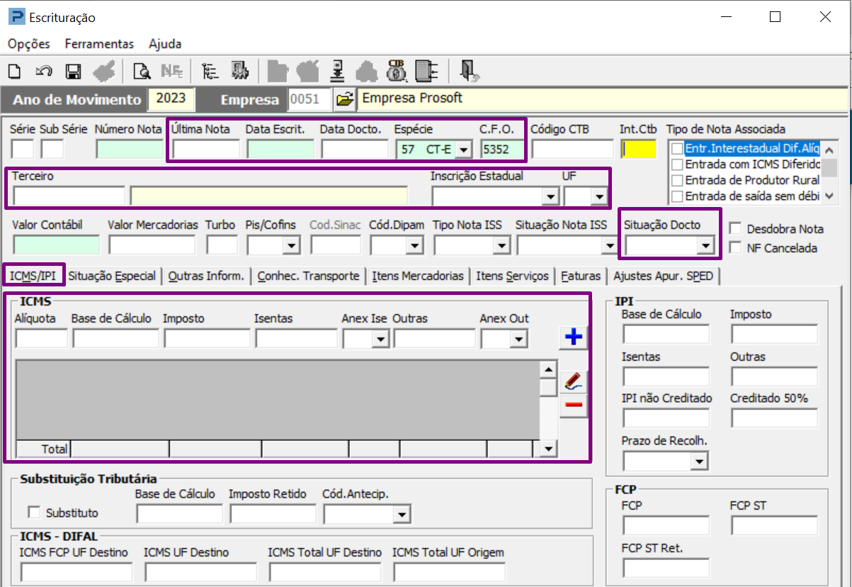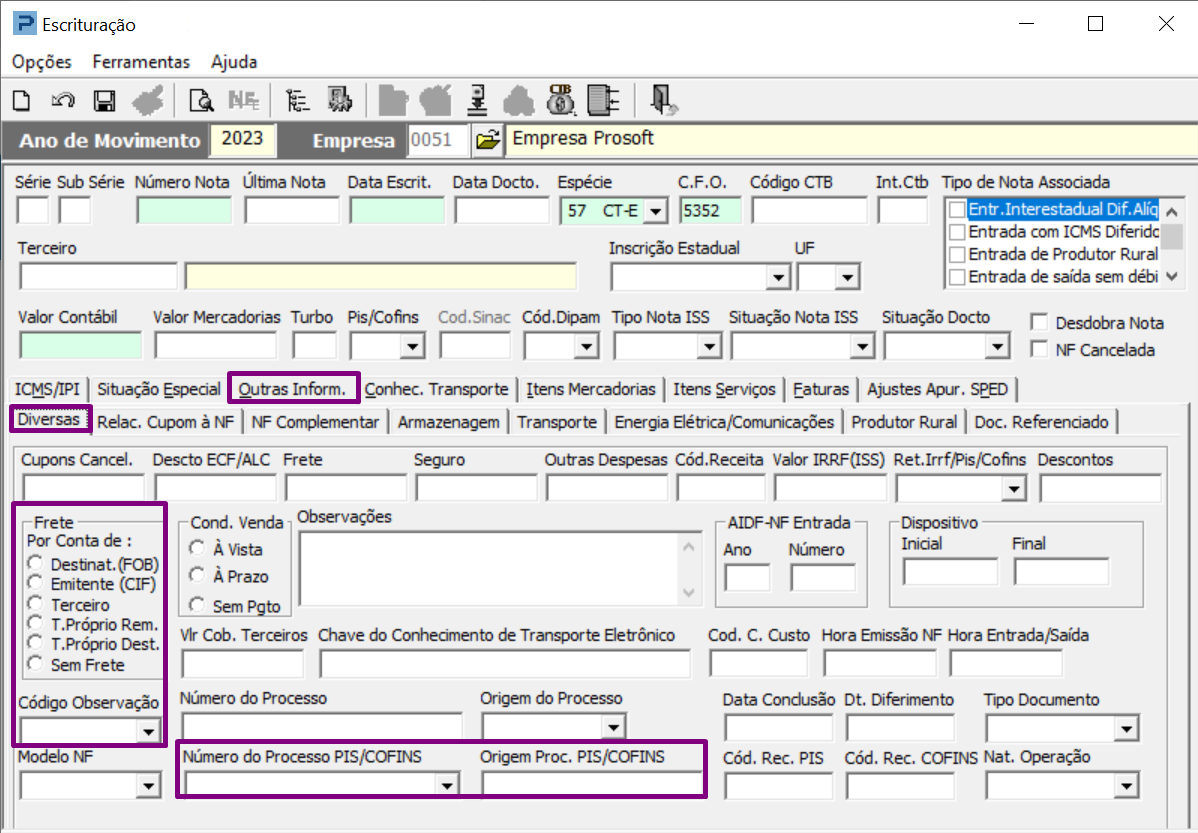 Na escrituração do conhecimento de transporte todos os campos em destaque são de preenchimento obrigatório, para determinar em qual registro as notas fiscais serão geradas, o sistema verifica a espécie e o CFOP utilizados.