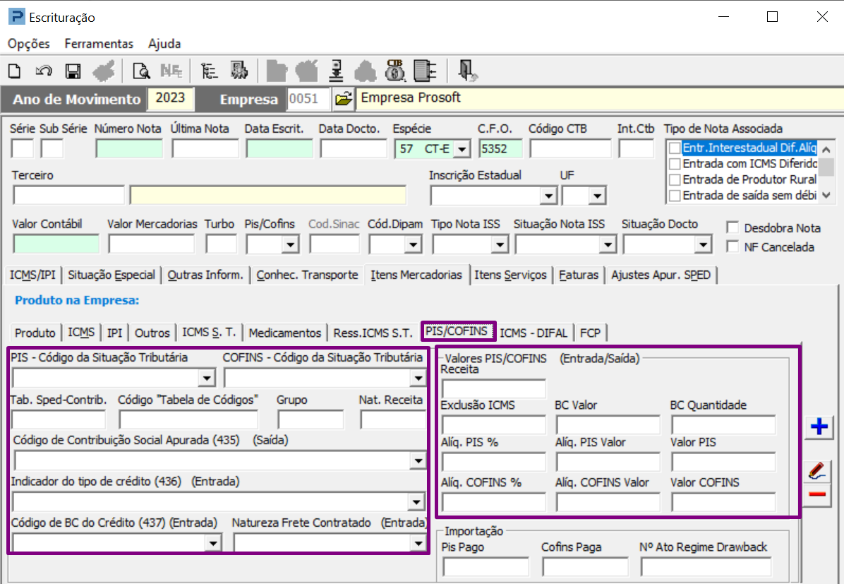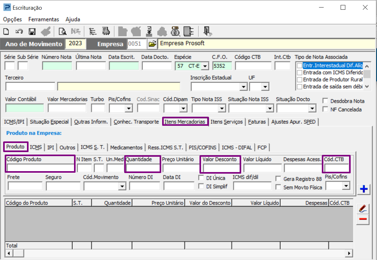 Na escrituração do conhecimento de transporte todos os campos em destaque são de preenchimento obrigatório, para determinar em qual registro as notas fiscais serão geradas o sistema verifica a espécie e o CFOP utilizados.